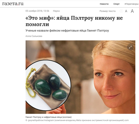 Дальше всех знаменитостей в теме заработка на популярности камней и кристаллов пошла актриса Гвинет Пэлтроу. В 2008 году она запустила компанию Goop, продвигающую товары в духе «нью-эйдж». В 2017 году она добавила в ассортимент нефритовые яйца, якобы повышающие «женскую энергию» и тонус мышц влагалища. Однако гинекологи раскритиковали использование камней яйцевидной формы из-за риска инфекций и вреда от постоянного напряжения мышц. Таким образом, нефритовые яйца стали маркетинговым мифом и никому не помогли.