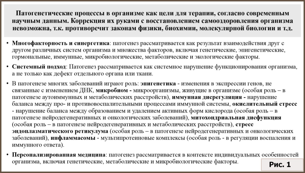 На фоне последних достижений медицинской науки концепция остеопатов о смещении органов, задерживающем некие потоки и неизвестные науке ритмы, как основной якобы причине разных болезней выглядит нелепо и архаично. На самом деле, заболевания развиваются при сочетании пусковых факторов и множества нарушений на молекулярном, клеточном и системном уровне (см. рис.1).