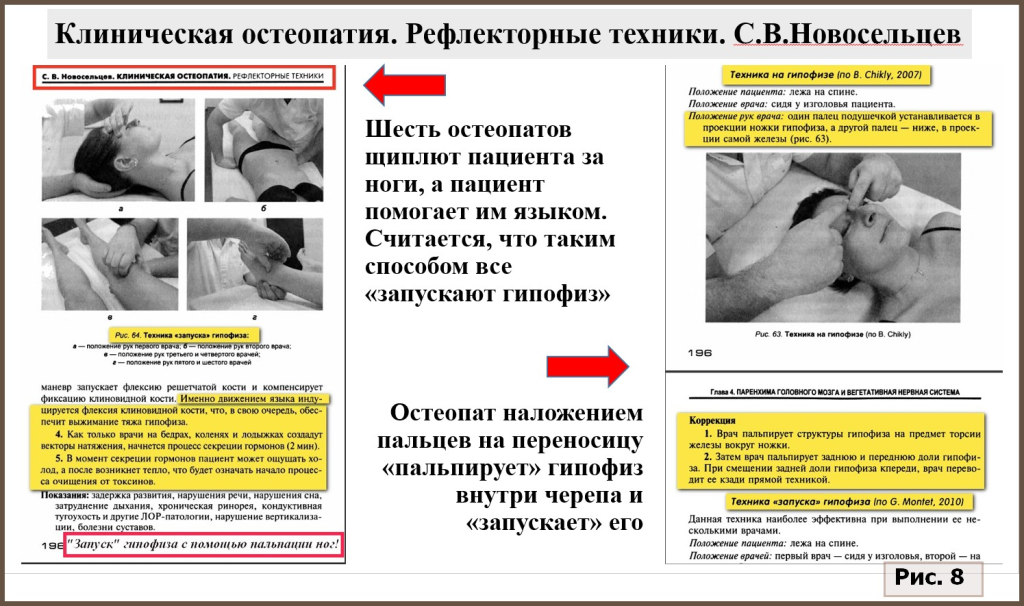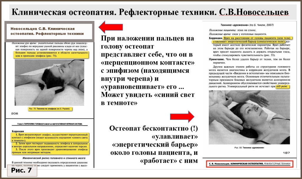 На рис. 7 и 8 представлены скриншоты страниц из монографии С.В.Новосельцева «Клиническая остеопатия. Рефлекторные техники» [27] с комментариями. Здесь описываются бесконтактные (!) техники с головой пациентки, а также «уравновешивание эпифиза» и «запуск гипофиза» наложением рук одного или нескольких остеопатов на ее голову и ноги. Ясно, что такие техники по естественно-научным законам не могут быть эффективными и потому не вписываются в научно обоснованную медицину.