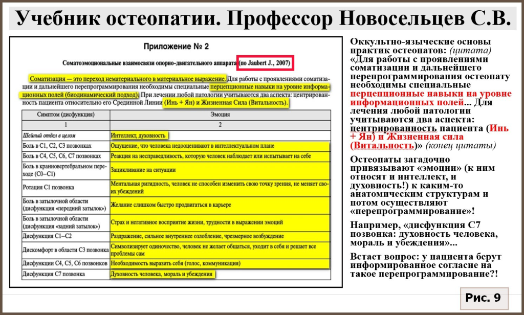 На рис. 9, 10 и 11 приведены скриншоты страниц из официального учебника по остеопатии [28], написанного проф. С.В.Новосельцевым, к которым мною были добавлены комментарии. Таблица с привязкой эмоций, моральных убеждений, духовности и т.д. к определенным анатомическим структурам человека в учебнике заимствована у французского остеопата-эзотерика Жюли Жобер (см. в таблице: «по Jaubert J., 2007»). Отметим, что Ж. Жобер регулярно приезжает к нам в Россию [29] для обучения молодых медиков, собирающихся стать остеопатами, «интегративной медицине», включающей идею реинкарнации, лжепсихологическую концепцию передачи человеку «травм из прошлых его жизней», нумерологию, биологическое декодирование, психогенеалогию и т.д. Что такое «интегративная медицина», добавляющая к научно обоснованной медицине разные эзотерические практики? За рубежом врачи, придерживающиеся доказательной медицины, для объяснения ее сути приводят аллегорию объединения навозной лепешки с яблочным пирогом. И хотя приверженцы такой интеграции предполагают, что навозная лепешка от этого станет лучше, на самом деле будет просто испорчен яблочный пирог [18].