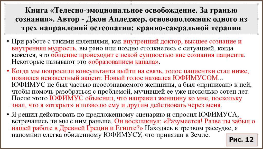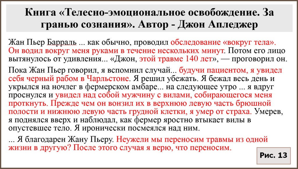 Апледжер придумал концепцию «энергетической кисты» как некоего сгустка не известной науке энергии в теле, который якобы образуется у человека в результате физической или психологической травмы и в отдаленном периоде вызывает у него болезни и создает разные проблемы в жизни. Для избавления от «энергетической кисты» Апледжер изобрел метод «телесно-эмоционального освобождения» (другие названия: сомато-эмоциональное освобождение, сомато-эмоциональный релиз), и изложил описание всех этих своих оккультных техник в книге «Телесно-эмоциональное освобождение. За гранью сознания», цитаты из которой мы и привели выше (рис. 12-14). Профессор Джин Мерсер в своей книге показывает неправдоподобие, отсутствие логики и доказательной базы у данных концепций [23, глава 5 «Телесно-ориентированная терапия, пассивная и активная»]. Попутно заметим, что у истоков концепции об эмоционально-мышечных энергетических блоках в теле человека стоял австрийский психолог, неофрейдист, пропагандист теории свободной сексуальной жизни, Вильгельм Райх. Он известен как создатель телесно-ориентированной терапии и в не меньшей степени – как «зачинщик» мировой сексуальной революции [38].