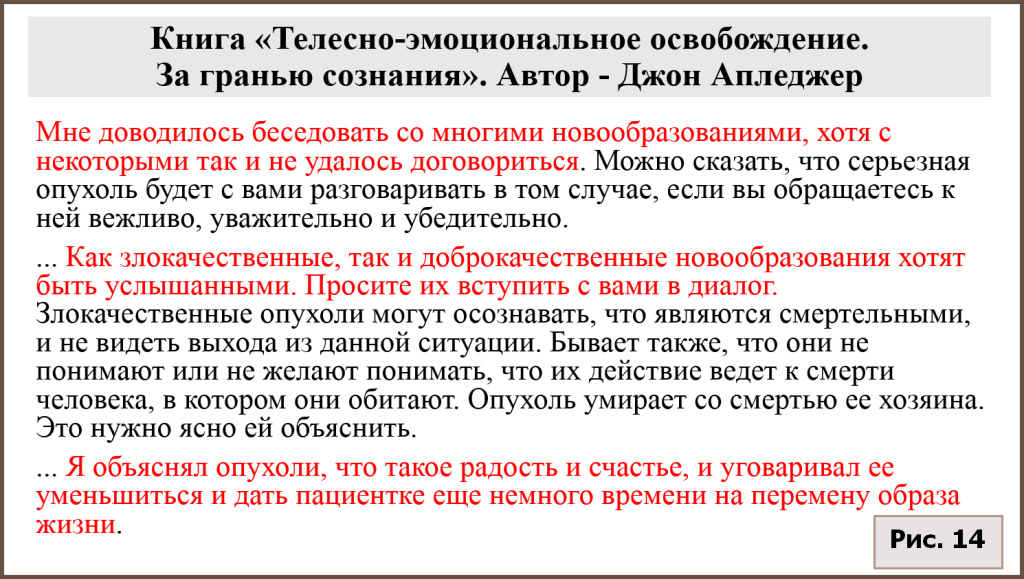 В книгах «классика» остеопатии, основателя одного из трех главных ее направлений – кранио-сакральной терапии (КСТ), Джона Апледжера, описывается метод биокоммуникации, диалога с тканями пациента, с опухолями и с неким «внутренним врачом». Как можно понять из помещенных ниже цитат из книги Апледжера [37], это — оккультный метод ченнелинга (контактерства). Кроме того, читателей, будущих остеопатов, обучают бесконтактным методам, внушают идеи реинкарнации и наличия сознания у опухолей (рис. 12, 13, 14):