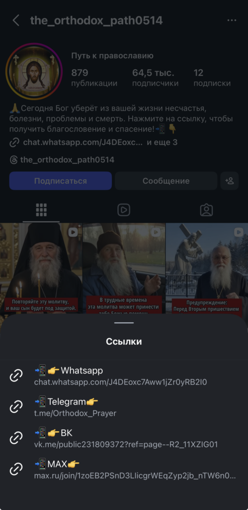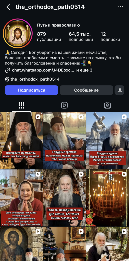 Паблик «Путь к православию» существует в Instagram (площадка компании Meta, признанной экстремистской в РФ) с конца 2024 года. Снаружи это поток религиозного контента: ролики с «монахами», «священниками», «благообразными бабушками», чтение молитв, краткие наставления, обещания поддержки.