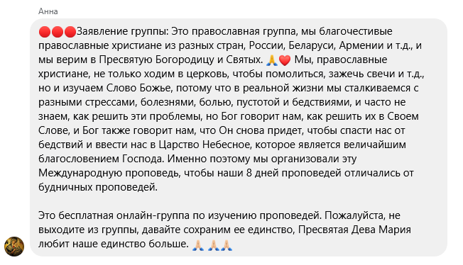 Внутри чат объявляется «православным». Группа говорит, что участники — «благочестивые православные христиане из разных стран», что они верят в Пресвятую Богородицу и святых, что они не только ходят в храм, но и «изучают Слово Божье», потому что в жизни много стрессов, болезней, бедствий, и Бог якобы «в Своём Слове» даёт решение. Затем появляется просьба‑директива: «Пожалуйста, не выходите из группы, давайте сохраним её единство». Обратите внимание на логику: единство чата подаётся как духовная ценность, а уход из группы — почти как грех против Богородицы.