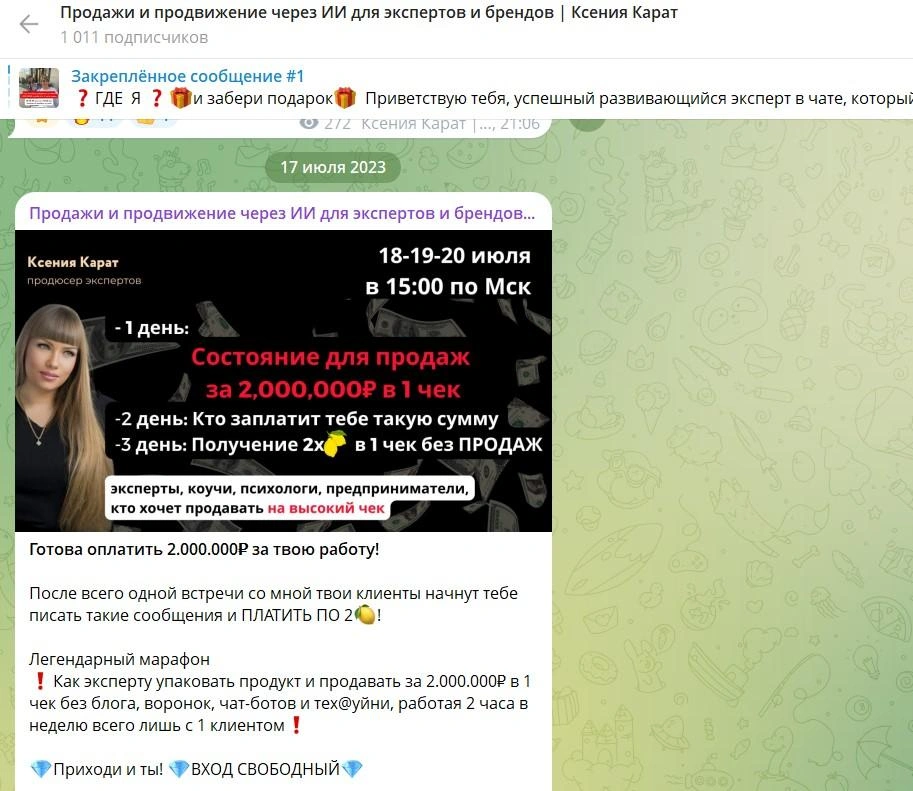 Однако в 2023 году, когда на ее марафон пришла Ирина Некрасова, концепция выглядела иначе. В Telegram-канале Ксении Карат тогда активно продвигались квантовые расстановки, трансформационные игры и гипнокоучинг — всё это, как утверждалось, должно было помочь «делать чек в 1 миллион рублей». В тот период предпринимательница называла себя денежным наставником экспертов и парапсихологом.
