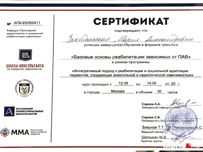 После чего решила дополнительно пройти курс, в 2017 году в «Центре психологической безопасности» овладела эриксоновским гипнозом.