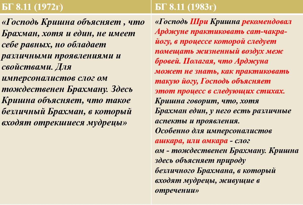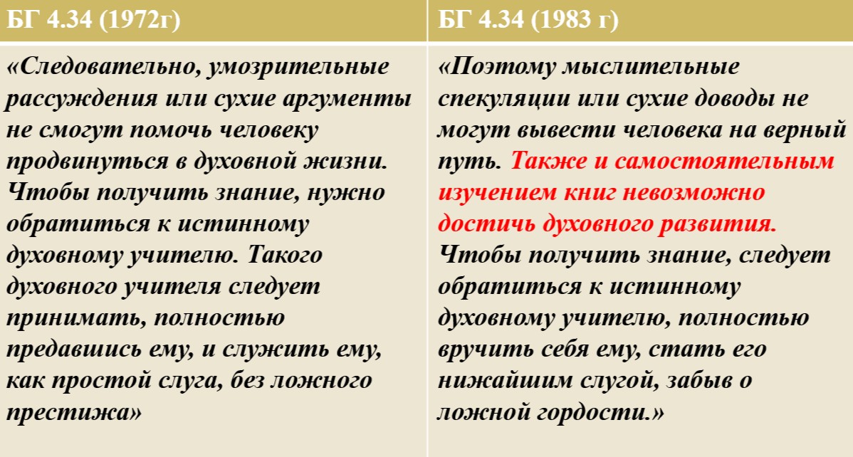 Например, в 34-м стихе 4-й главы «Гиты» кришнаитов редакторы ББТ дополнили текст комментария 1972 года целым предложением: «Также и самостоятельным изучением книг невозможно достичь духовного развития» (см. рис.1).