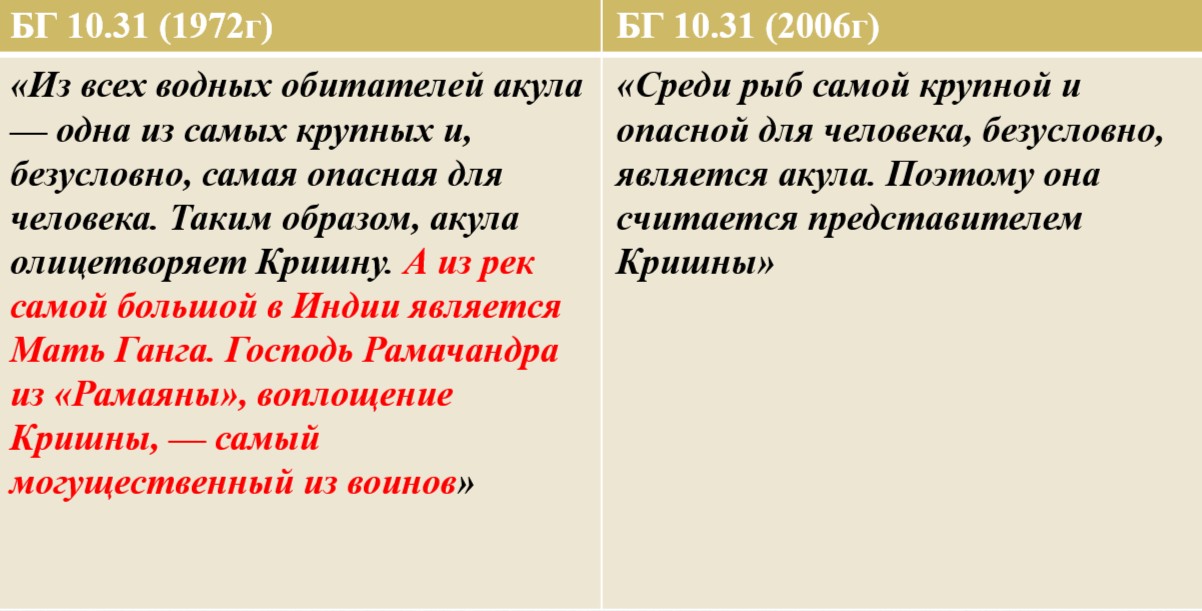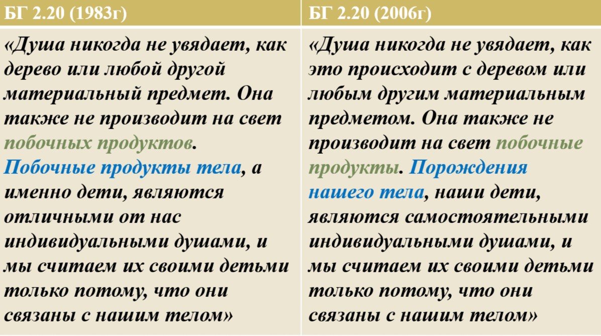 Однако это оправдание легко опровергается тем, что в новом – «исправленном» – тексте «Бхагавад-гиты как она есть» не просто изменялись отдельные слова или стиль предложений, но и добавлялись новые предложения или, наоборот, полностью исчезали некоторые фрагменты.