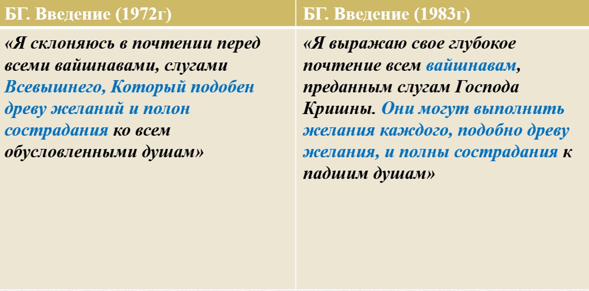 Уже во введении «Бхагавад-гиты как она есть» 1983 года видны значительные смысловые изменения. Если в издании 1972 года «Всевышний» сравнивался с «древом желаний» и считался «полным сострадания», то в версии 1983 года эти качества приписываются только вайшнавам (кришнаитам). Таким образом вайшнавы противопоставляются «Всевышнему», что, по мнению критиков, умаляет его величие (см. рис. 5).