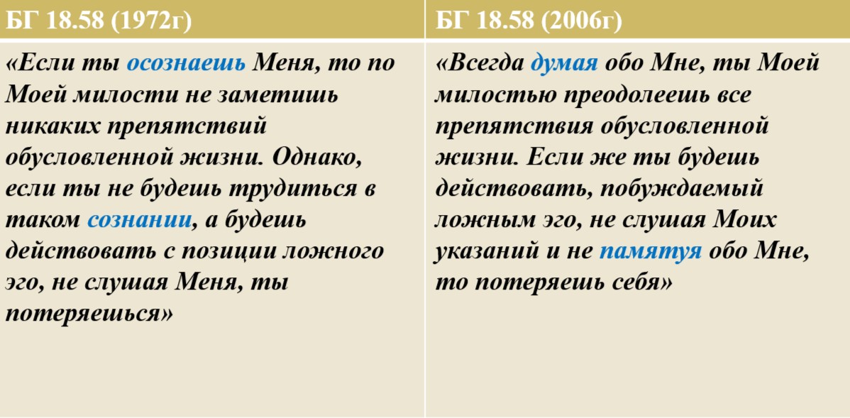 В главе 18 перевод 58-го стиха претерпел значительные изменения, затрагивающие ключевые аспекты веры кришнаитов (см. рис. 6). Если в издании «Бхагавад-гиты как она есть» 1972 года подчеркивалась необходимость быть в «сознании Кришны», то из версии 2000-х годов следует, что достаточно просто всегда думать о Кришне и помнить о нем. В учении «Международного общества сознания Кришны» разница между «думать о Кришне» и «пребывать в сознании Кришны» весьма значительна.