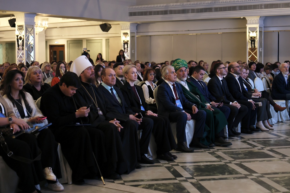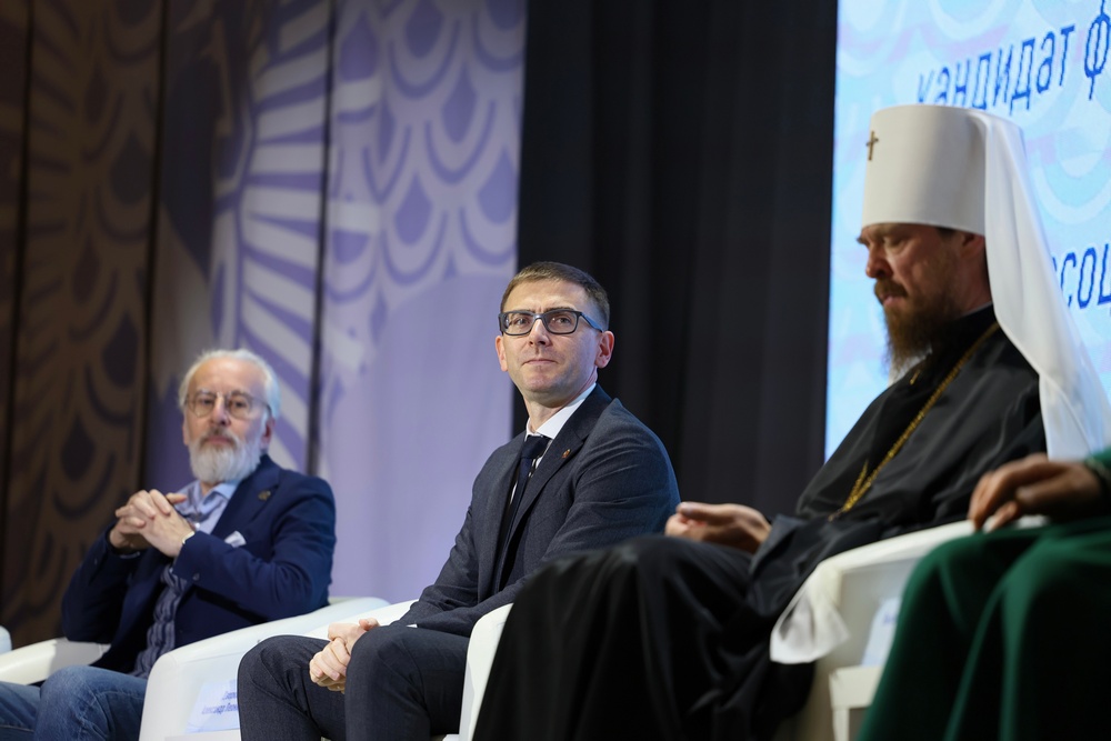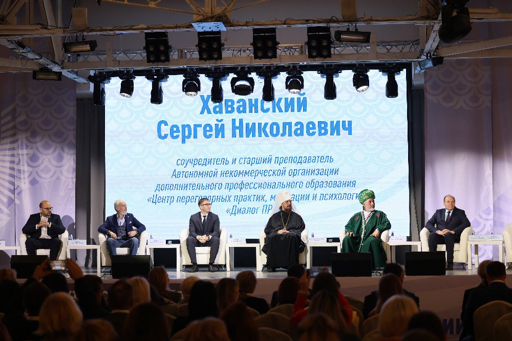 Пленарное заседание, которое прошло в Изумрудном зале, открыл и вел модератор Сергей Хаванский, известный медиатор и эксперт в области коммуникации, кандидат юридических наук, ведущий практик по посредничеству в урегулировании споров, включая этноконфессиональные конфликты. В своем вступительном слове он обозначил ключевую тему дискуссии: «В эпоху глобальных вызовов и информационных войн именно сфера духа, ценностей и идентичности становится полем главных сражений за будущее».