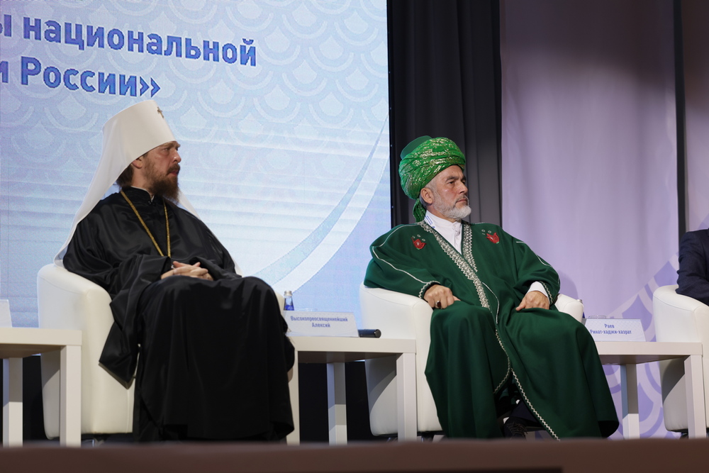 Митрополит Алексий призвал в вопросе духовных основ национальной безопасности к формированию не только «оборонительных», но и «наступательных» стратегий. А главный муфтий Ринат хаджи-хазрат Раев подтвердил эту мысль, рассказав о реальных провокациях, направленных на раскол общества, и важности консолидации в их преодолении.